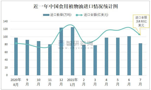 根據(jù)中國海關(guān)數(shù)據(jù)顯示:2021年7月中國食用植物油進口數(shù)量為83萬噸,同比下降21.9%,進口金額為8.92億美元,同比增長12.1%,2021年1-7月中國食用植物油進口數(shù)量為662萬噸,進口金額為65.91億美元。