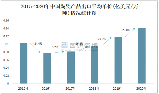 2015-2020年中國陶瓷產品出口平均單價(億美元/萬噸)情況統計圖