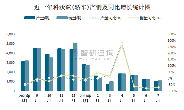 近一年科沃茲(轎車)產銷及同比增長統計圖