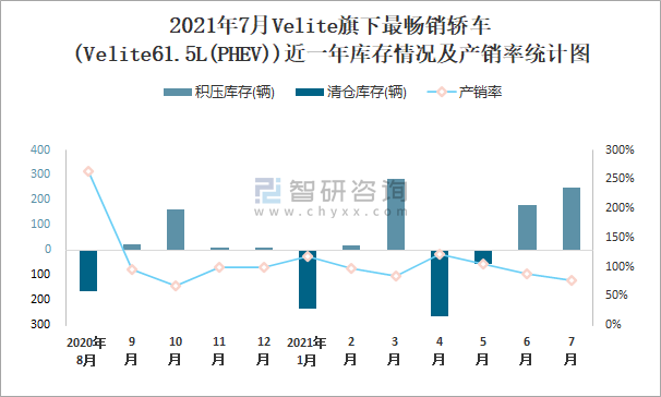 2021年7月VELITE旗下最暢銷車(Velite61.5L(PHEV))近一年庫存情況及產銷率統計圖
