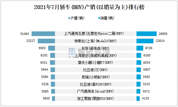 2021年7月轎車(BEV)產銷(以銷量為主)排行榜