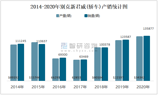 2014-2020年別克新君威(轎車)產(chǎn)銷統(tǒng)計圖