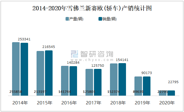 2014-2020年雪佛蘭新賽歐(轎車)產(chǎn)銷統(tǒng)計圖