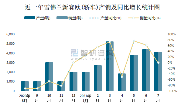 近一年雪佛蘭新賽歐(轎車)產(chǎn)銷及同比增長統(tǒng)計圖