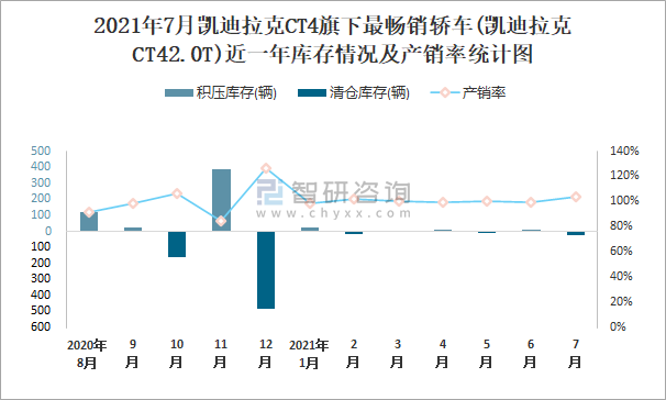 2021年7月凱迪拉克CT4旗下最暢銷車(凱迪拉克CT42.0T)近一年庫存情況及產銷率統計圖