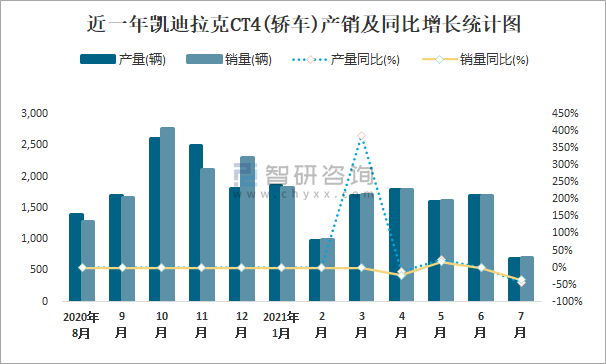 根據中國汽車工業協會數據可知:2021年7月凱迪拉克CT4(轎車)產量為689輛,同比下降42.6%,銷量為714輛,同比下降35.1%,當月產銷率為103.63%;2021年1-7月凱迪拉克CT4(轎車)累計產量為10323輛,同比增長55.4%,累計銷量為10343輛,同比增長59.4%,累計產銷率為100.19%;且2020年凱迪拉克CT4(轎車)總產量大于總銷量,積壓了庫存43輛。
