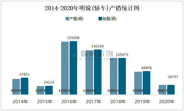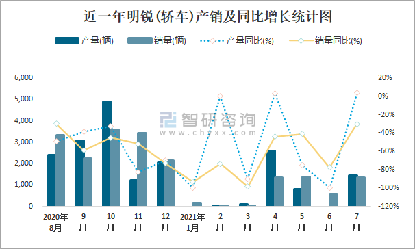 根據中國汽車工業協會數據可知:2021年7月明銳(轎車)產量為1438輛,同比增長3.6%,銷量為1349輛,同比下降30.3%,當月產銷率為93.81%;2021年1-7月明銳(轎車)累計產量為4948輛,同比下降62.6%,累計銷量為4834輛,同比下降59.6%,累計產銷率為97.7%;2014-2020年明銳(轎車)產銷量均在2016年達到最高值,此后逐年遞減,且近7年總銷量大于總產量,清倉庫存10405輛。