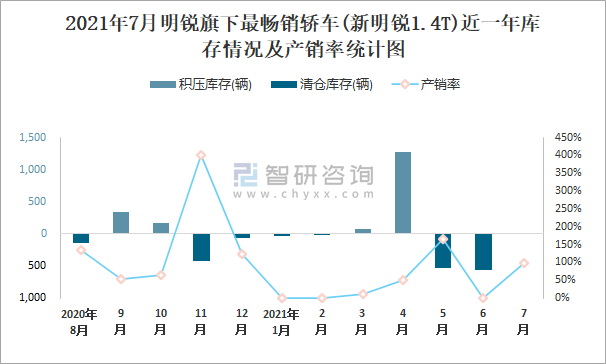 2021年7月明銳旗下最暢銷車(新明銳1.4T)近一年庫存情況及產銷率統計圖