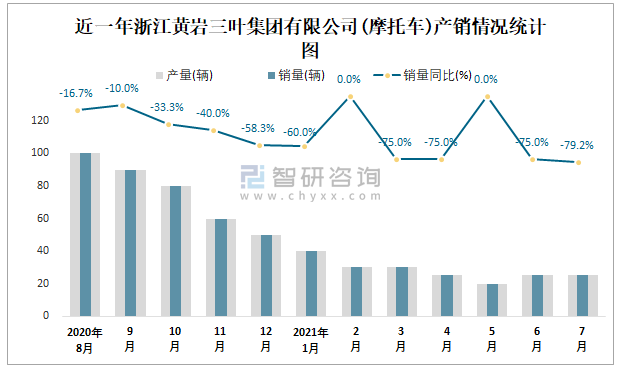 根據中國汽車工業(摩托車)產銷快訊數據顯示:2021年7月浙江黃巖三葉集團有限公司(摩托車)產量為25輛,同比下降79.17%,銷量為25輛,同比下降79.17%;2021年1-7月浙江黃巖三葉集團有限公司(摩托車)累計產量為195輛,同比下降70.45%,累計銷量為195輛,同比下降70.45%;2016-2020年浙江黃巖三葉集團有限公司(摩托車)產銷量逐年遞減,且近5年總銷量等于總產量,無積壓庫存,庫存管理良好,暫未出口,全部依靠內銷。