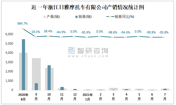 根據(jù)中國汽車工業(yè)(摩托車)產(chǎn)銷快訊數(shù)據(jù)顯示:2021年7月浙江日雅摩托車有限公司(摩托車)產(chǎn)量為156輛,同比下降94.33%,銷量為151輛,同比下降95.8%;2021年1-7月浙江日雅摩托車有限公司(摩托車)累計產(chǎn)量為977輛,同比下降91.13%,累計銷量為274輛,同比下降97.45%;2016-2020年浙江日雅摩托車有限公司(摩托車)產(chǎn)銷量2017年跌至最低值,此后總體呈現(xiàn)上升趨勢,且近5年總產(chǎn)量大于總銷量,積壓了庫存1390輛,總體銷量以出口為主。
