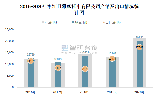 2016-2020年浙江日雅摩托車有限公司產(chǎn)銷及出口情況統(tǒng)計圖