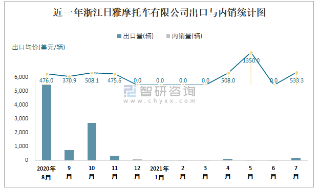 根據(jù)中國汽車工業(yè)(摩托車)產(chǎn)銷快訊數(shù)據(jù)統(tǒng)計可知:近一年浙江日雅摩托車有限公司(摩托車)共積壓庫存1463輛,其產(chǎn)銷率存在一定幅度波動,2020年12月產(chǎn)銷率最高(250%),清倉庫存78輛,2月產(chǎn)銷率偏低(2%),積壓庫存98輛;近一年浙江日雅摩托車有限公司(摩托車)出口量偏少,銷量以內(nèi)銷為主,總出口量占比總銷量的97.7%,出口均價5月達(dá)到最大值,此后總體呈現(xiàn)下降趨勢,其中7月出口量為150輛,出口均價約為533.33美元/輛;2021年1-7月浙江日雅摩托車有限公司(摩托車)累計出口量為227輛,同比下降97.21%,累計出口金額約為12.08萬美元,同比下降96.91%。