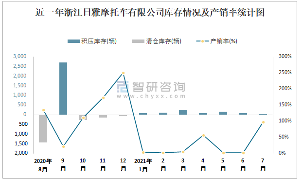 近一年浙江日雅摩托車有限公司庫存情況及產(chǎn)銷率統(tǒng)計圖