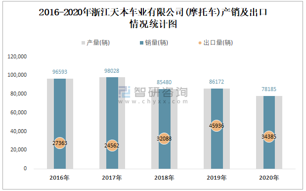 2016-2020年浙江天本車業(yè)有限公司產(chǎn)銷及出口情況統(tǒng)計圖