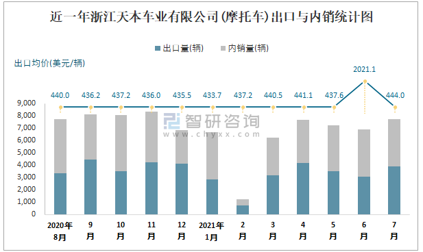 根據(jù)中國汽車工業(yè)(摩托車)產(chǎn)銷快訊數(shù)據(jù)統(tǒng)計可知:2021年7月中國摩托車產(chǎn)量總計為1721567輛,同比增長5.6%,銷量總計為1721887輛,同比增長4.26%,產(chǎn)銷率約為100.02%,清倉庫存-320輛,其中總計出口量為723084輛,內(nèi)銷998803輛,出口均價約為633.62美元/輛。浙江天本車業(yè)有限公司作為浙江本土車企的摩托車企業(yè)之一,7月銷量相較于同類型車企,排名比較靠前,且以出口為主。