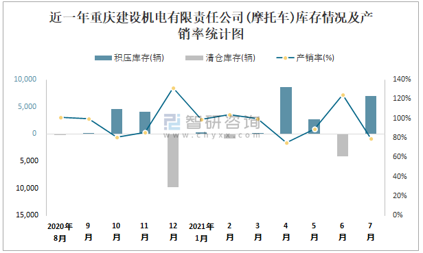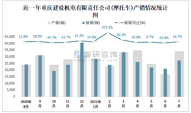 根據中國汽車工業(摩托車)產銷快訊數據顯示:2021年7月重慶建設機電有限責任公司(摩托車)產量為34253輛,同比增長32.91%,銷量為27202輛,同比增長14.7%;2021年1-7月重慶建設機電有限責任公司(摩托車)累計產量為195845輛,同比增長29.37%,累計銷量為182061輛,同比增長21.77%;2018-2020年重慶建設機電有限責任公司(摩托車)產銷量2019年跌至最低值,次年有所回升,且近3年總產量大于總銷量,積壓了庫存556輛,出口量偏少,銷量以內銷為主。