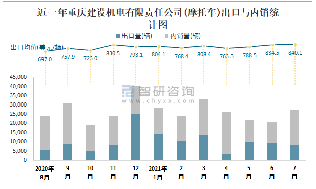 根據中國汽車工業(摩托車)產銷快訊數據統計可知:近一年重慶建設機電有限責任公司(摩托車)共積壓庫存12500輛,其產銷率存在一定幅度波動,2020年12月產銷率最高(131.61%),清倉庫存9752輛,4月產銷率偏低(75.19%),積壓庫存8632輛;近一年重慶建設機電有限責任公司(摩托車)出口量偏少,銷量以內銷為主,總出口量占比總銷量的38%,出口均價7月達到最高值,其中7月出口量為8166輛,出口均價約為840.07美元/輛;2021年1-7月重慶建設機電有限責任公司(摩托車)累計出口量為69147輛,同比增長32.33%,累計出口金額約為5558萬美元,同比增長56.61%。