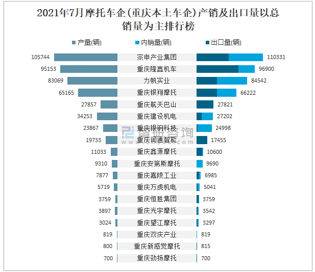 2021年7月摩托車企(重慶本土車企)產銷及出口量(以總銷量為主)排行榜