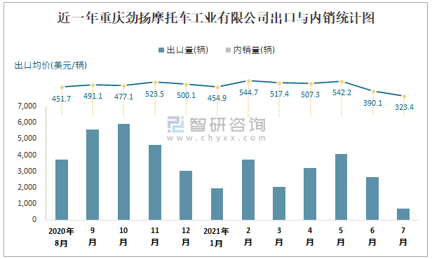 根據中國汽車工業(摩托車)產銷快訊數據統計可知:2021年7月中國摩托車產量總計為1721567輛,同比增長5.6%,銷量總計為1721887輛,同比增長4.26%,產銷率約為100.02%,清倉庫存-320輛,其中總計出口量為723084輛,內銷998803輛,出口均價約為633.62美元/輛。重慶勁揚摩托車工業有限公司作為重慶本土車企的摩托車企業之一,7月銷量相較于同類型車企,排名最后,且以出口為主。