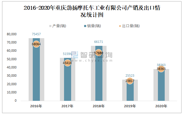 2016-2020年重慶勁揚摩托車工業有限公司產銷及出口情況統計圖