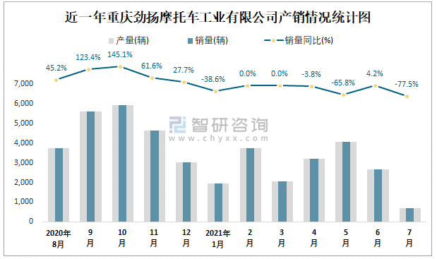 近一年重慶勁揚摩托車工業有限公司產銷情況統計圖
