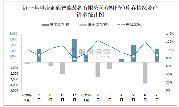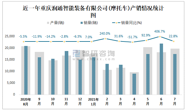根據中國汽車工業(摩托車)產銷快訊數據顯示:2021年7月重慶潤通智能裝備有限公司(摩托車)產量為19733輛,同比增長42.59%,銷量為17455輛,同比增長22.8%;2021年1-7月重慶潤通智能裝備有限公司(摩托車)累計產量為107595輛,同比增長53.54%,累計銷量為107883輛,同比增長54.79%;2019-2020年重慶潤通智能裝備有限公司(摩托車)產銷量有所下滑,且近2年總產量大于總銷量,積壓了庫存4455輛,銷量以出口為主。