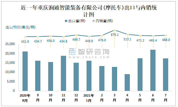 根據中國汽車工業(摩托車)產銷快訊數據統計可知:2021年7月中國摩托車產量總計為1721567輛,同比增長5.6%,銷量總計為1721887輛,同比增長4.26%,產銷率約為100.02%,清倉庫存-320輛,其中總計出口量為723084輛,內銷998803輛,出口均價約為633.62美元/輛。重慶潤通智能裝備有限公司作為重慶本土車企的摩托車企業之一,7月銷量相較于同類型車企,排名處于中等水平,且以出口為主。