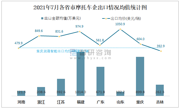 2021年7月各省市摩托車企出口情況均值統計圖