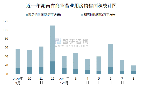 2021年8月湖南省商業營業用房銷售面積為19.71萬平方米(現房銷售面積占比33.84%)