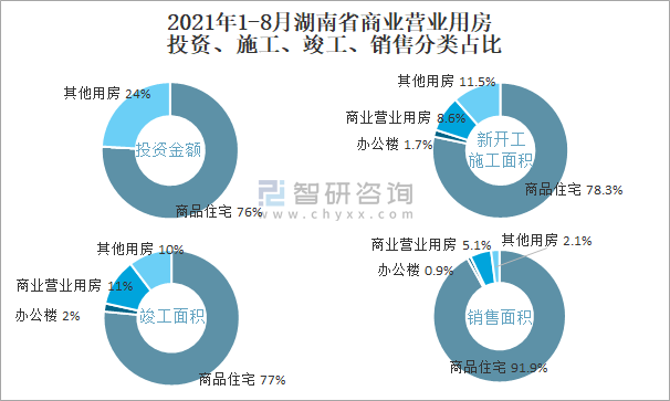 根據國家統計局數據統計可知:2021年1-8月湖南省房地產開發企業在包括商業營業用房在內的其他用房投資金額占比為24.1%(注:只有投資金額中其他用房包含辦公樓、商業營業用房),商業營業用房的新開工面積與竣工面積所占比重差異不大,從銷售面積來看,商業營業用房銷售面積占比高于辦公樓銷售面積占比。
