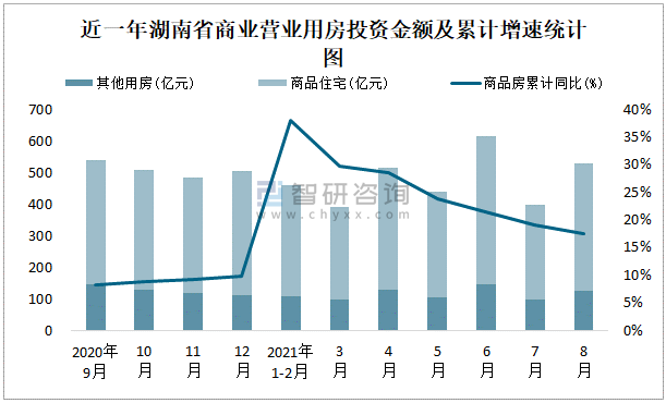根據國家統計局數據統計可知:2021年8月湖南省房地產開發投資商品房投資金額為528.23億元,其中包括辦公樓、商業營業用房等其他用房126億元(注:辦公樓、商業營業用房未分開統計);2021年1-8月湖南省房地產開發投資包括商業營業用房在內的其他用房累計金額為805.57億元。