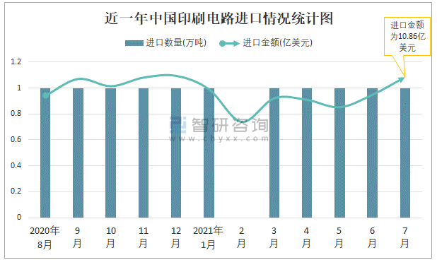 根據中國海關數據顯示:2021年7月中國印刷電路進口數量為1萬噸,同比增長3.1%,進口金額為10.86億美元,同比增長21.2%,2021年7月中國印刷電路出口數量為3萬噸,同比增長35.8%,出口金額為18.83億美元,同比增長42.4%;2021年1-7月中國印刷電路進口數量為4萬噸,進口金額為64.6億美元,出口數量為21萬噸,出口金額為113億美元。