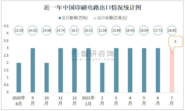 2021年7月中國印刷電路進出口數量分別為1萬噸和3萬噸
