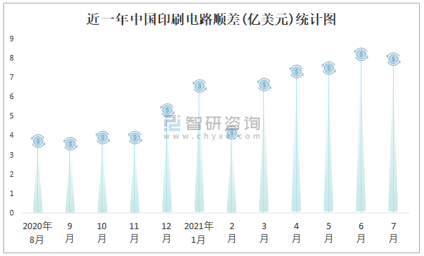 根據中國海關數據顯示:近一年中國印刷電路進口金額總體小于出口金額,進出口貿易全部為順差,順差規模在6月達到最大,7月有所縮減。