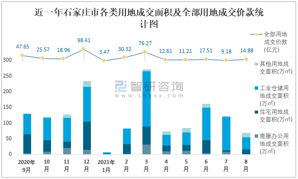 近一年石家莊市各類用地成交面積及全部用地成交價款統計圖