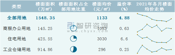 根據國信房地產信息網數據統計可知:2021年8月石家莊市全部用地出讓地面均價為2059元/㎡,其中住宅用地出讓地面均價最高(8438元/㎡),全部用地成交地面均價為2180元/㎡,其中住宅用地成交地面均價為7638元/㎡,高于商服辦公用地成交地面均價;2021年1-8月石家莊市工業倉儲用地樓面面積占其全部用地比重最多,為59.09%,溢價率為0.25%。