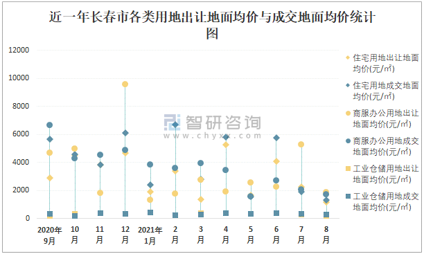 近一年長春市各類用地出讓地面均價與成交地面均價統(tǒng)計圖