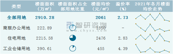 根據(jù)國信房地產(chǎn)信息網(wǎng)數(shù)據(jù)統(tǒng)計可知:2021年8月長春市全部用地出讓地面均價為345元/㎡,其中商服辦公用地出讓地面均價最高(1845元/㎡),全部用地成交地面均價為424元/㎡,其中住宅用地成交地面均價為1310元/㎡,低于商服辦公用地成交地面均價;2021年1-8月長春市住宅用地樓面面積占其全部用地比重最多,為76.13%,溢價率為2.83%。