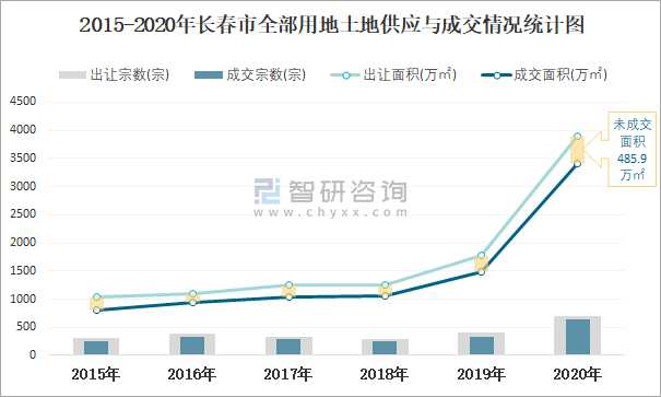 2015-2020年長春市全部用地土地供應(yīng)與成交情況統(tǒng)計圖