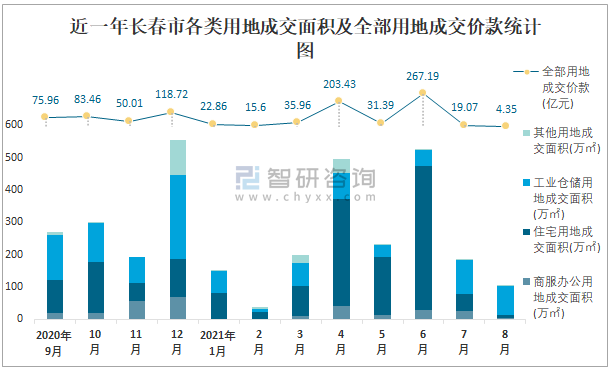 近一年長春市各類用地成交面積及全部用地成交價款統(tǒng)計圖