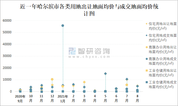 近一年哈爾濱市各類用地出讓地面均價與成交地面均價統(tǒng)計圖