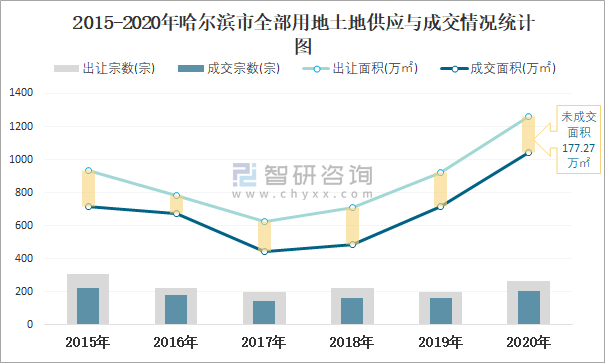 2015-2020年哈爾濱市全部用地土地供應(yīng)與成交情況統(tǒng)計圖