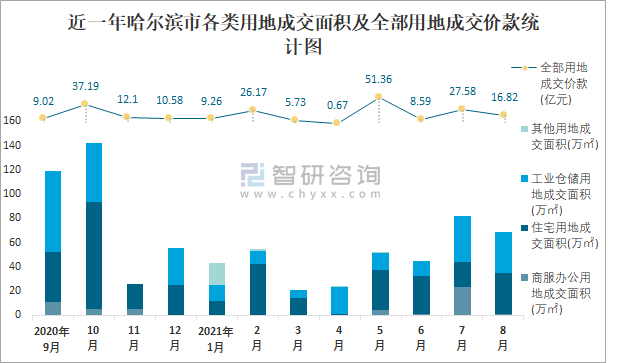 近一年哈爾濱市各類用地成交面積及全部用地成交價款統(tǒng)計圖