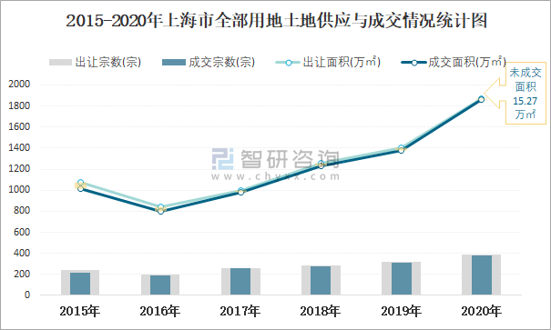 2015-2020年上海市全部用地土地供應與成交情況統(tǒng)計圖