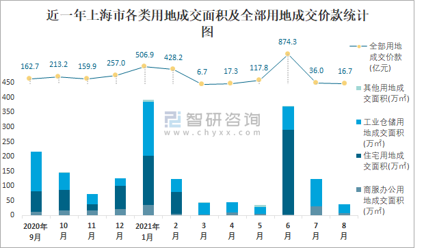 近一年上海市各類用地成交面積及全部用地成交價款統(tǒng)計圖