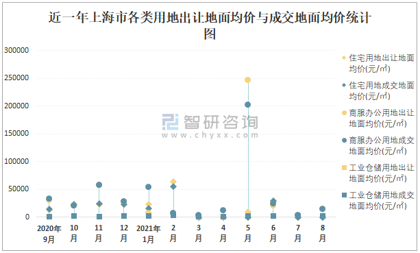 近一年上海市各類用地出讓地面均價與成交地面均價統(tǒng)計圖