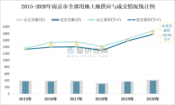2015-2020年南京市全部用地土地供應與成交情況統計圖