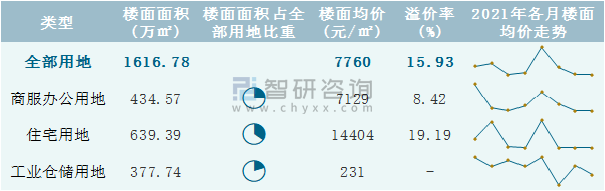 根據國信房地產信息網數據統計可知:2021年8月南京市全部用地出讓地面均價為780元/㎡,其中商服辦公用地出讓地面均價最高(2246元/㎡),全部用地成交地面均價為813元/㎡;2021年1-8月南京市住宅用地樓面面積占其全部用地比重最多,為39.55%,溢價率為19.19%。