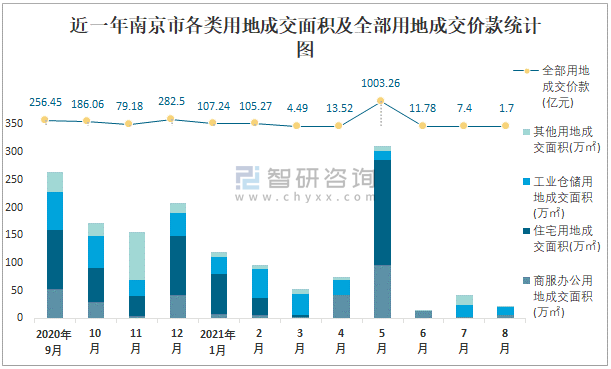 近一年南京市各類用地成交面積及全部用地成交價款統計圖