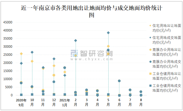 近一年南京市各類用地出讓地面均價與成交地面均價統計圖
